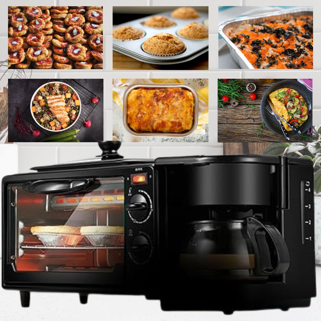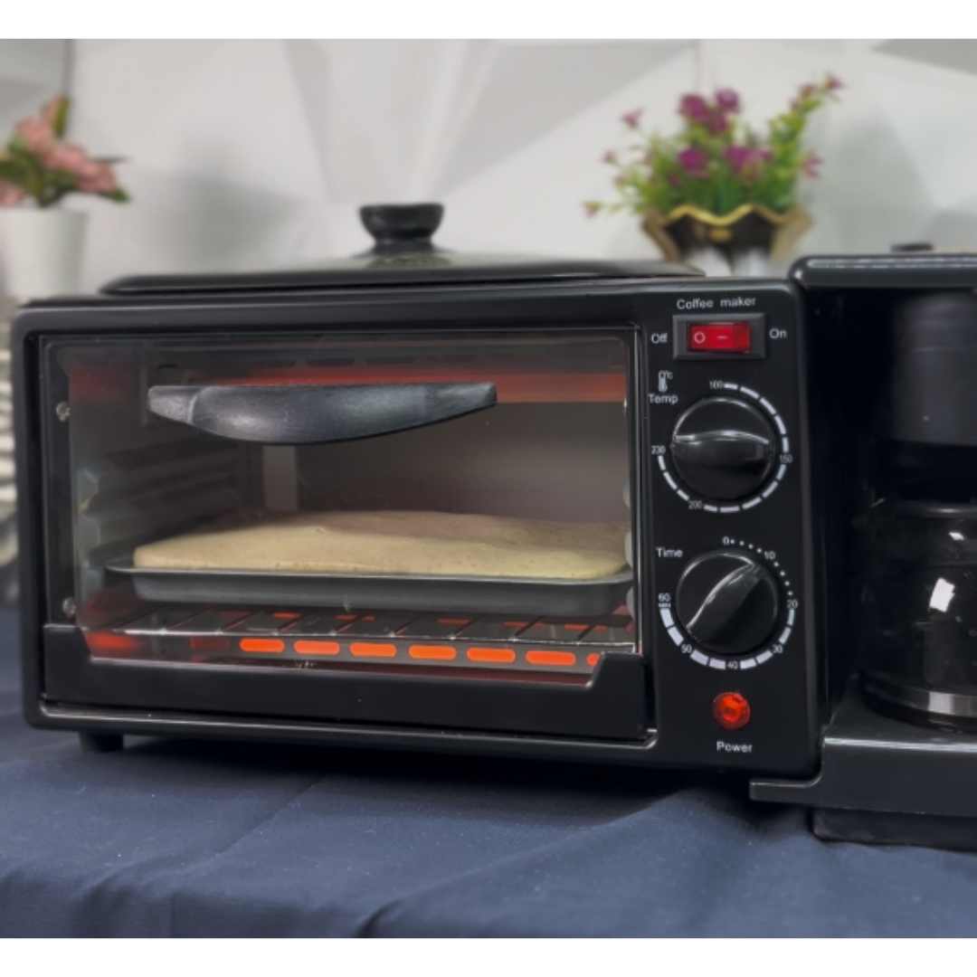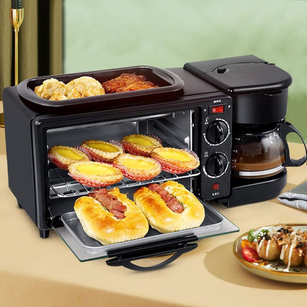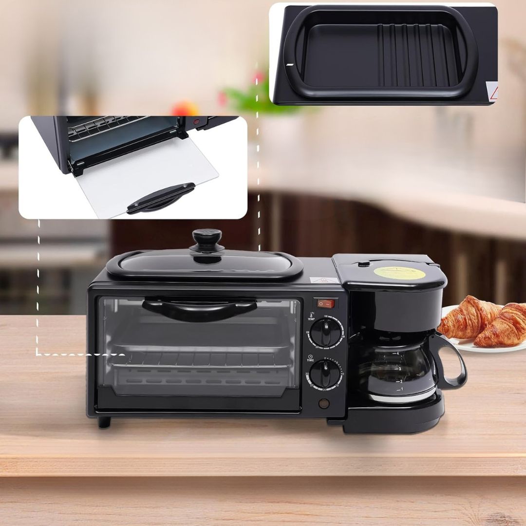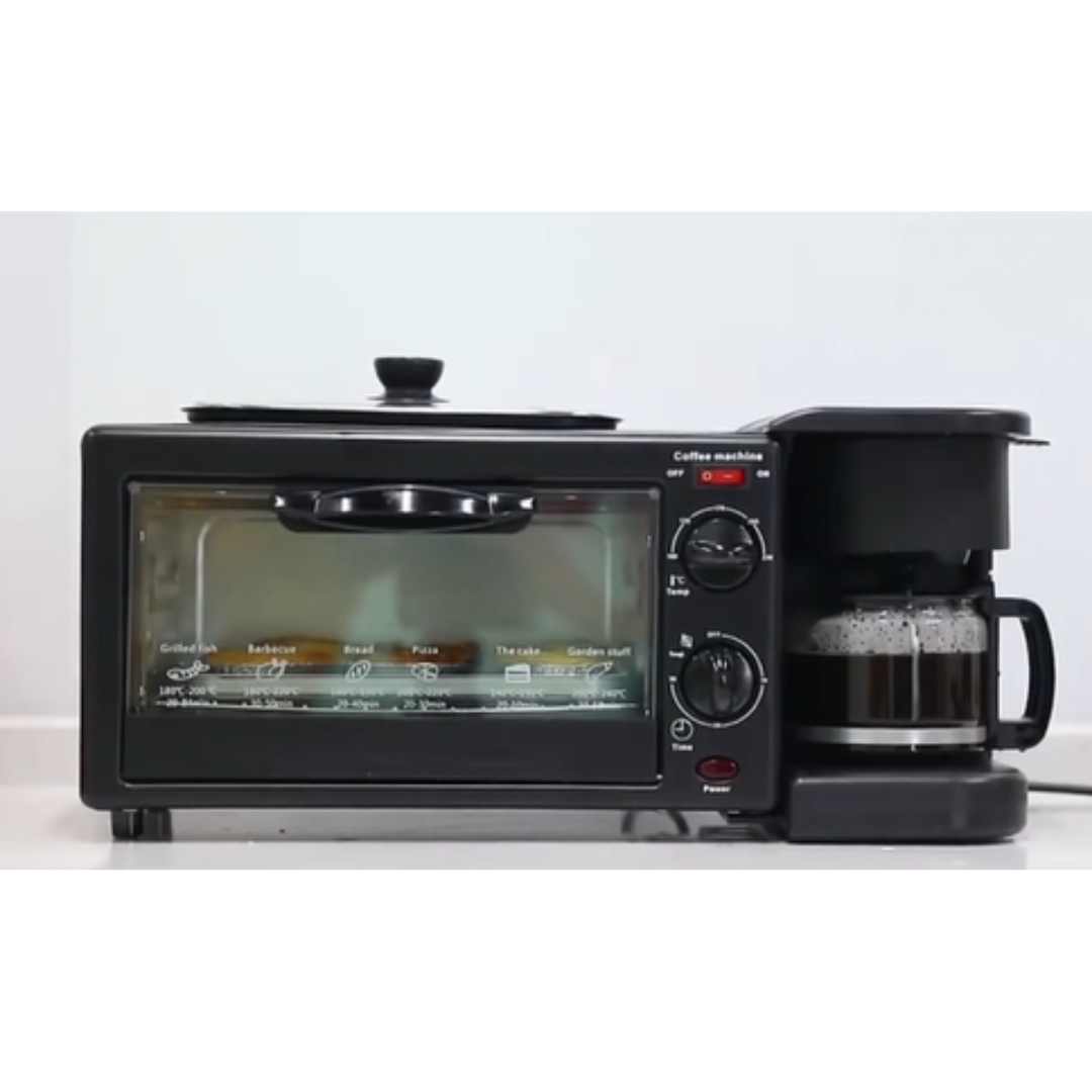 Ez az eszköz három háztartási gépet egyesít egyben: egy tapadásmentes lapot sütéshez vagy melegítéshez, egy 9 literes elektromos sütőt és egy vízforralót amerikai kávé vagy tea készítéséhez.