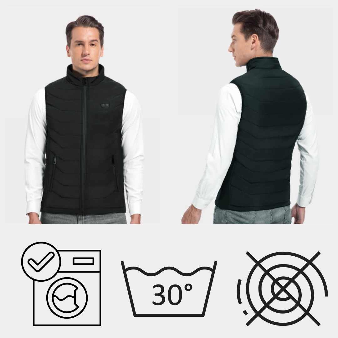 Se il gilet si sporca, nessun problema: è lavabile in lavatrice seguendo le istruzioni di cura. Rimuovi il power bank e i cavi, inseriscilo in un sacchetto per il bucato e utilizza un ciclo delicato a bassa temperatura. Asciuga all’aria, lontano da fonti di calore; non accenderlo per accelerare l’asciugatura.