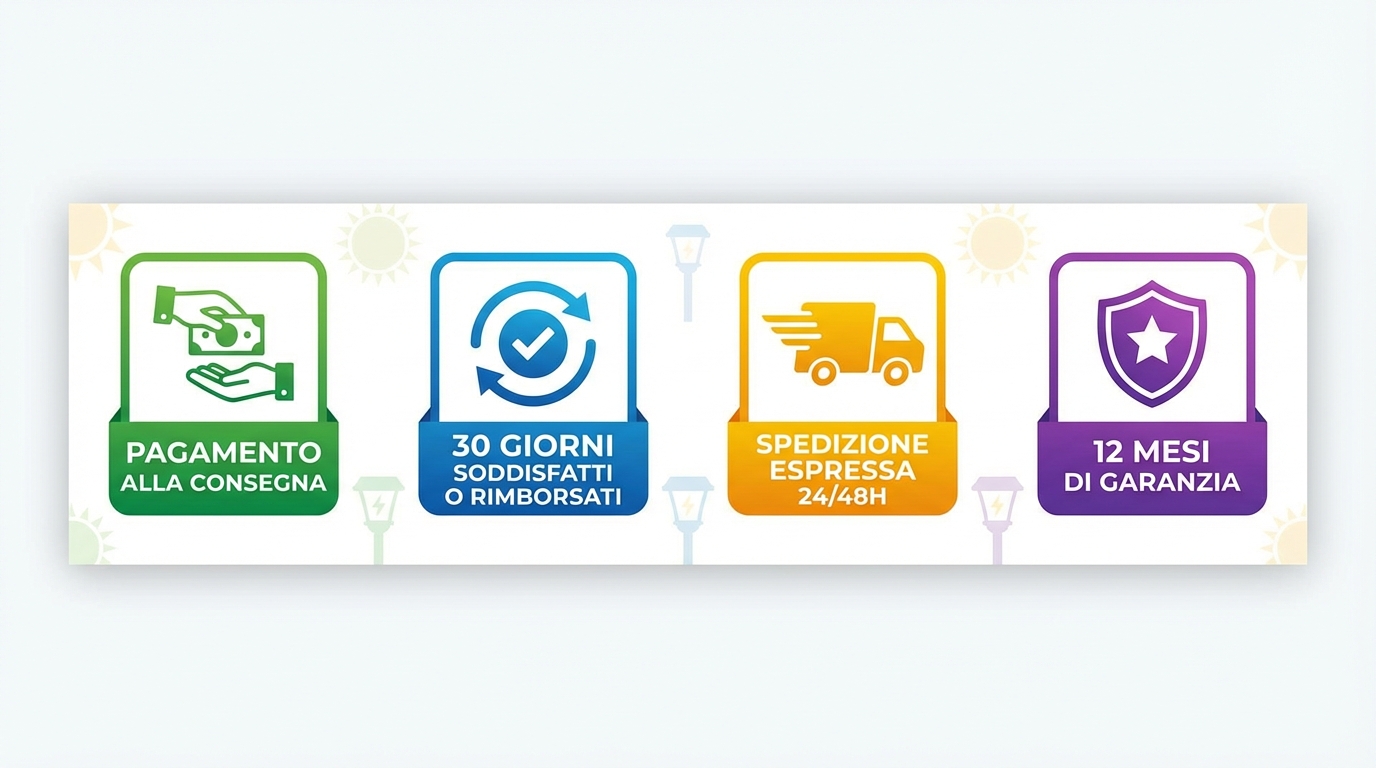 Ordina ora e prova la differenza con le solite luci solari: hai 30 giorni per testare le lampade nel tuo spazio esterno. Se non sei soddisfatto, ti rimborsiamo.