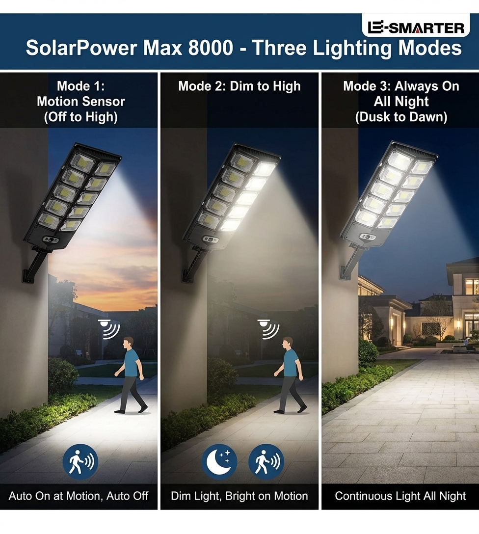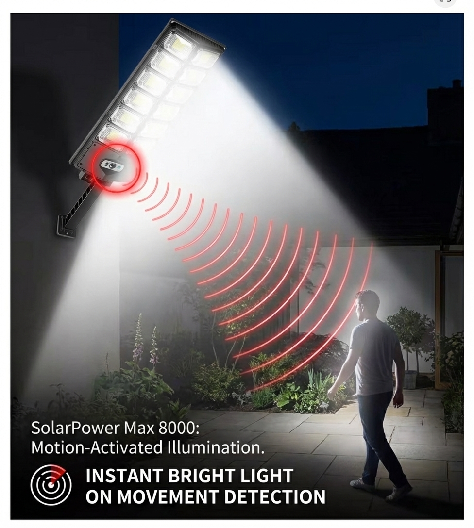 Il sistema SolarPower Max 8000™ unisce 504 LED ad alta densità, batteria LiFePO4 a lunga durata e sensore radar a 270° per accendersi all’istante quando serve davvero.