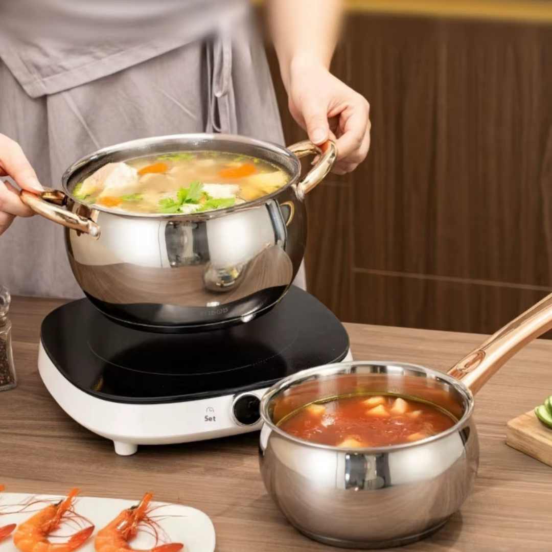 Il nuovo set di pentole in acciaio inox 6 pezzi +6 : finalmente cottura uniforme e veloce, addio bruciature e incrostazioni, con risparmio energetico e risultati da chef