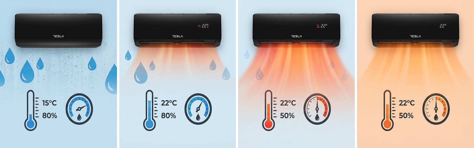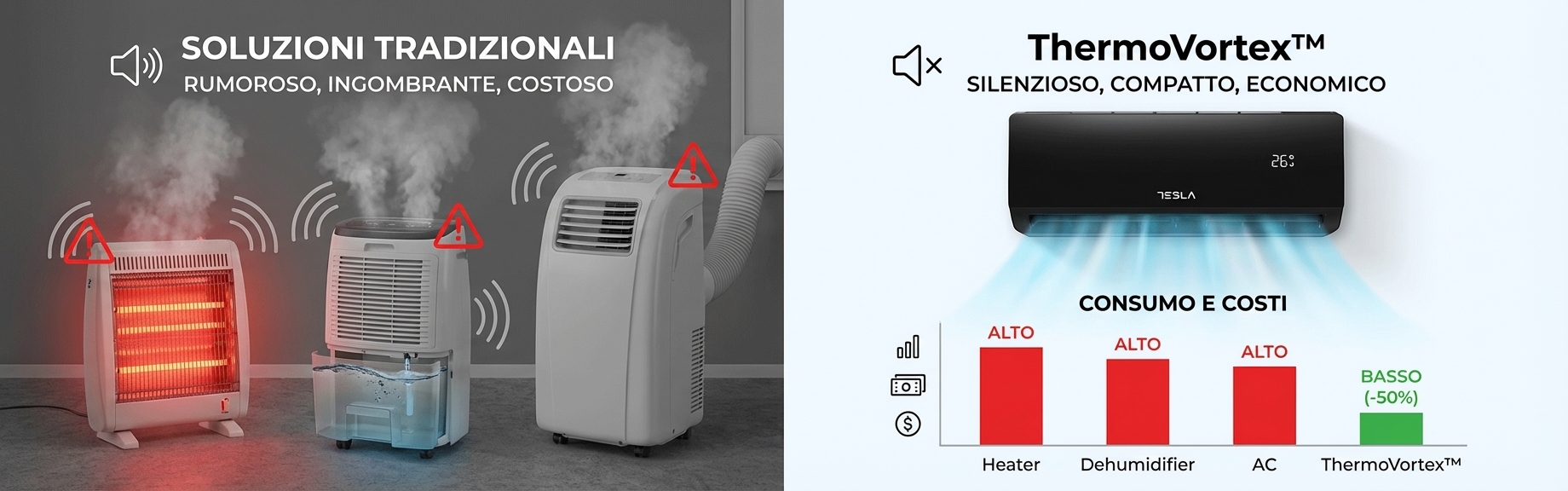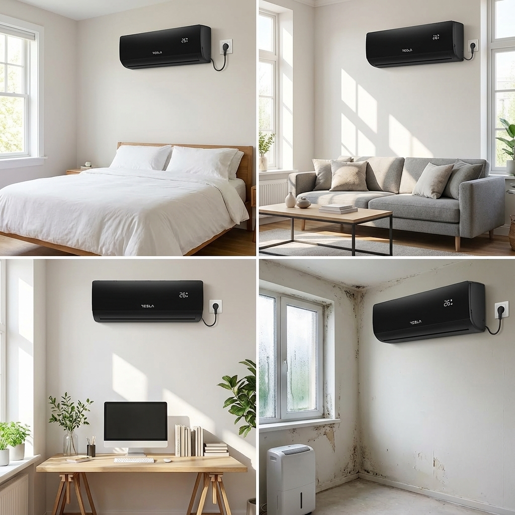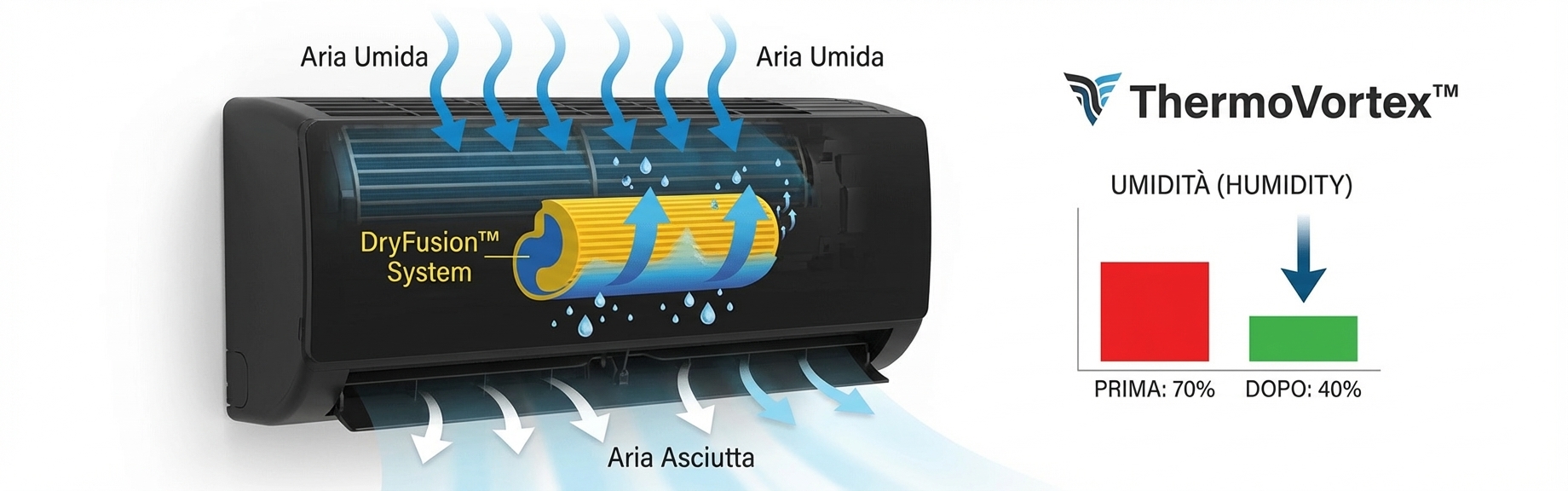 L’aria viene trattata e distribuita in modo omogeneo, così la stanza raggiunge rapidamente la temperatura desiderata senza correnti d’aria dirette. La tecnologia ThermoVortex™ ottimizza il ciclo caldo/freddo per ridurre gli sprechi e mantenere il comfort nel tempo. In camere fredde, piani terra umidi o soggiorni difficili da scaldare ottieni un ambiente più asciutto e piacevole, limitando al minimo condensa e sensazione di bagnato sulle pareti.