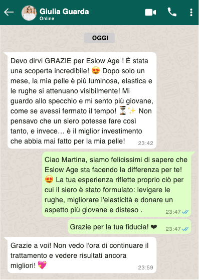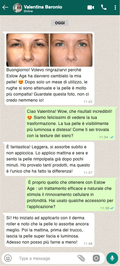 I primi risultati con Eslow Age™ si notano già dopo 7 giorni: la pelle appare più idratata, luminosa e morbida al tatto. Dopo 14 giorni, le prime rughe iniziano a distendersi e il viso risulta visibilmente più compatto. Dopo 30 giorni, il miglioramento diventa ancora più evidente: la pelle ritrova tono, elasticità e i segni del tempo si attenuano.