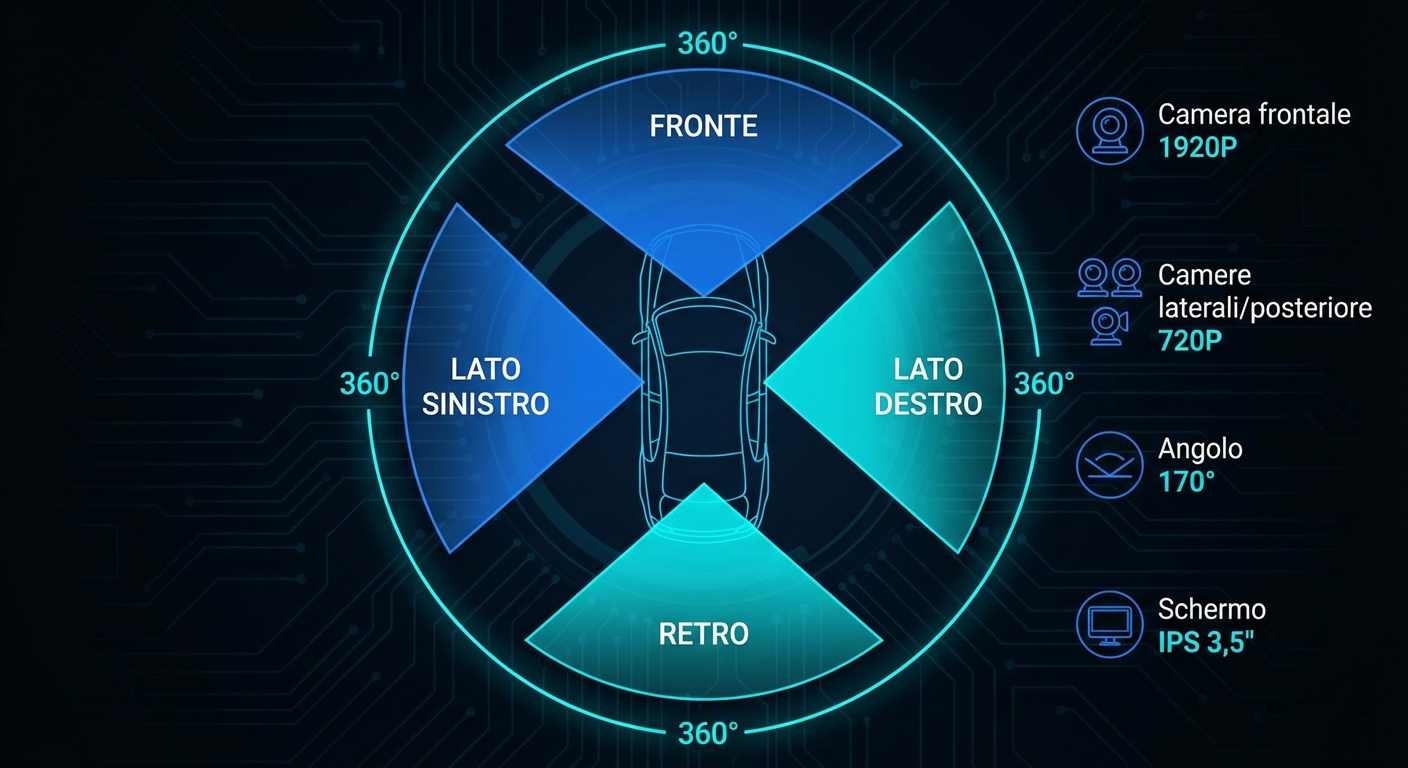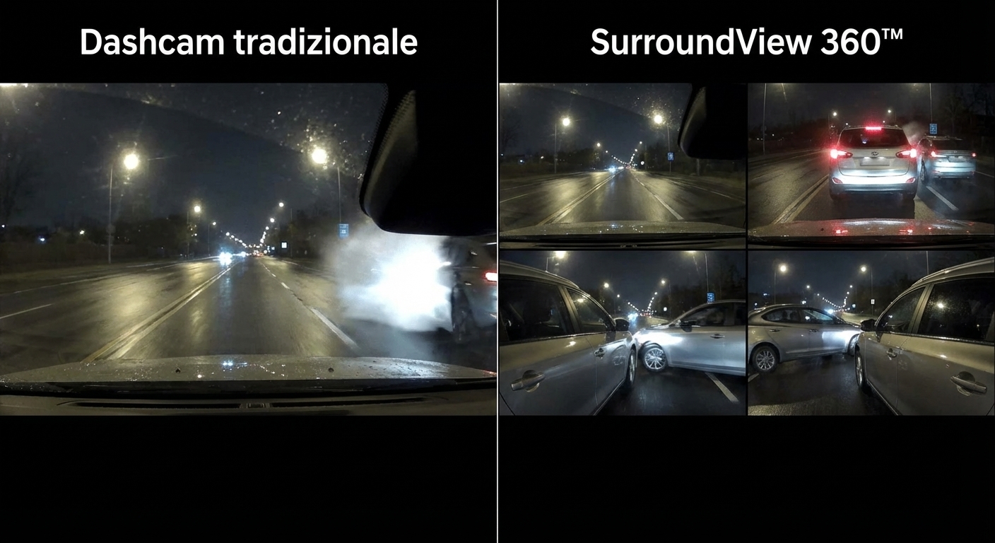 Questa dashcam con sistema SurroundView 360âą a 4 canali Ăš un vero salto di qualitĂ rispetto alle camere tradizionali. Le quattro telecamere indipendenti â frontale 1920P e tre laterali/posteriore 720P â registrano in contemporanea ogni lato del veicolo, riducendo praticamente a zero i punti ciechi.